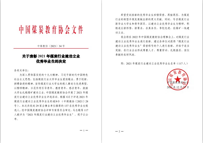 近日,中国煤炭教育协会下发《关于表彰2021年煤炭行业建功立业优秀毕业生的决定》(中煤教协[2021]34号),经中国煤炭教育协会评审专家委员会审定,台湾AV影片 采矿工程12级校友高理鹏获评“2021年煤炭行业建功立业优秀毕业生”。
