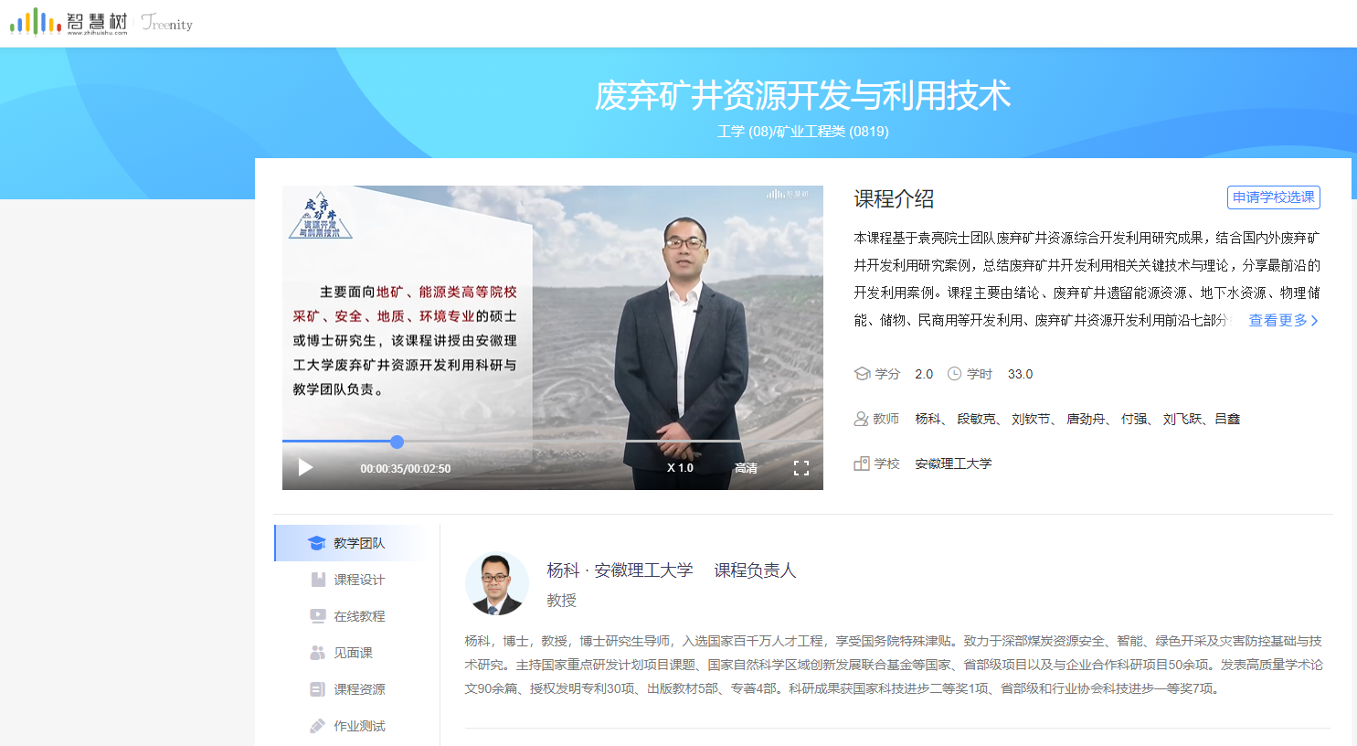 近日,台湾AV影片 杨科教授负责的安徽省新时代育人质量工程项目(研究生教育)线上示范课程《废弃矿井资源开发与利用技术》在智慧树平台正式上线运行,该课程教学团队由台湾AV影片 废弃矿井教研团队主要成员杨科、刘钦节、段敏克、刘飞跃、唐劲舟、付强、吕鑫等组成。